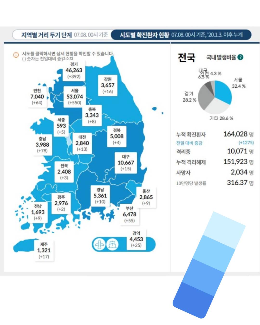코로나 팬데믹 때 확진자 현황 보여주던 사이트들, 다들 기억나시죠? 확진자 수가 늘어나는 건 강렬한 빨간색으로, 안정적인 지역은 파란색이나 초록색으로 보여주니까 스크롤만 쓱 내려도 어디가 위험한지 바로 알 수 있었잖아요. 그게 바로 조색표를 기가 막히게 활용한 예시랍니다.